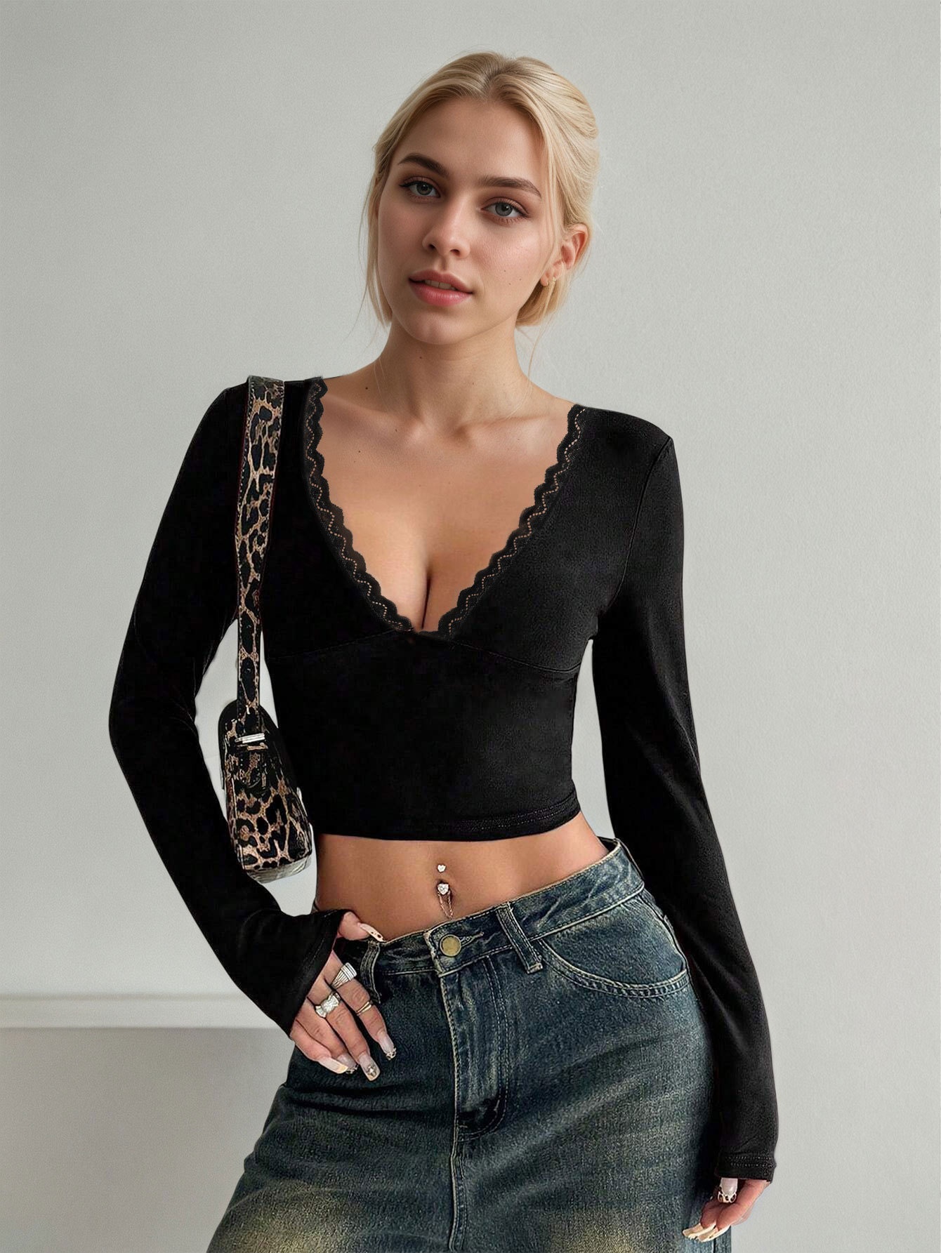 Sexy Sweet And Spicy Women's T-shirt Deep V Design Long Sleeve Base Top