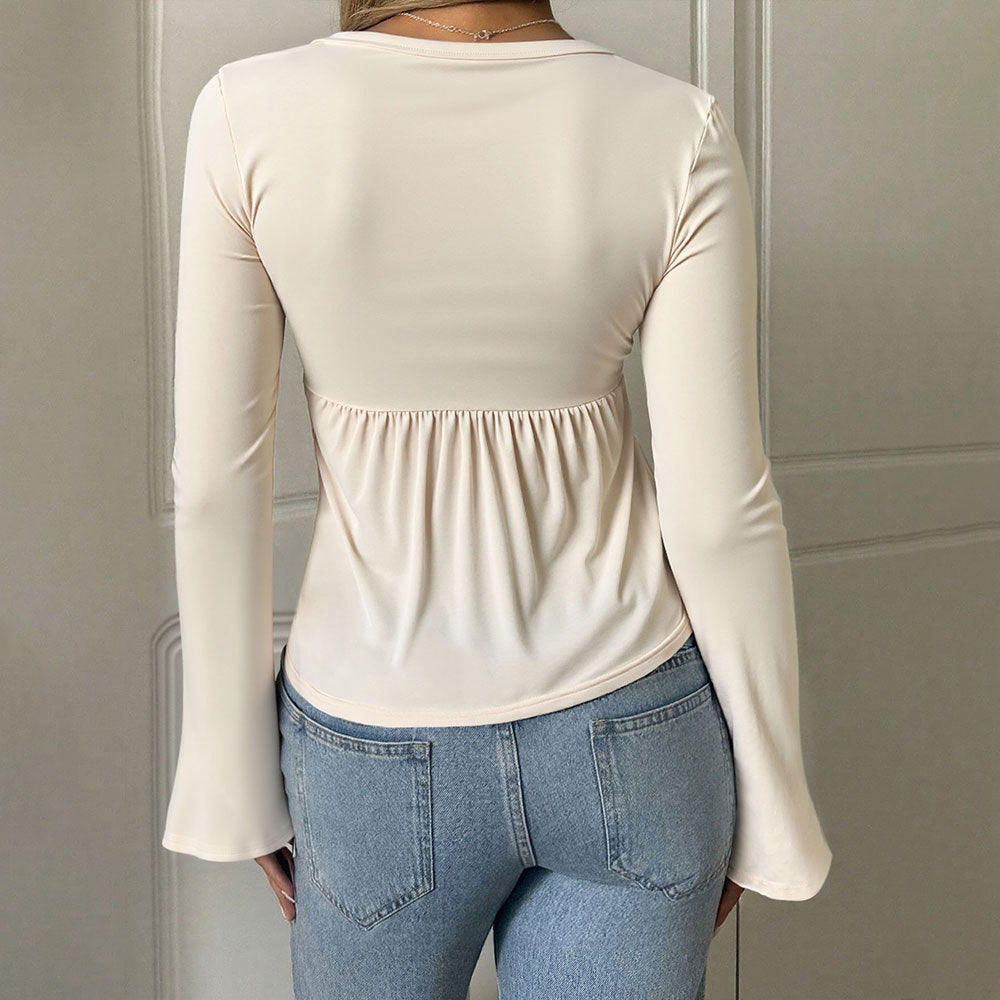 V-neck Long-sleeved Elegant Casual T-shirt Solid Color Pullover Ruffled Top